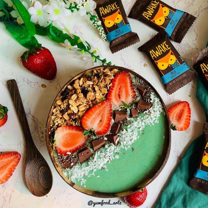 - Top with granola, strawberries, shredded coconut, chia seeds and AWAKE Chocolate.